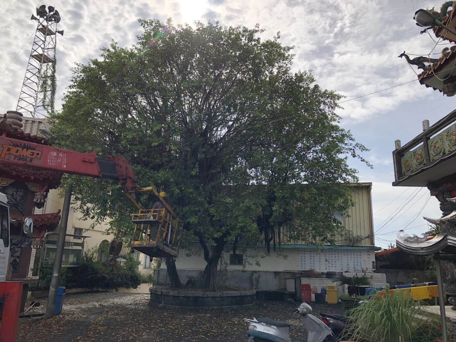 颱風天前夕樹木需要適度疏枝修剪,未修剪前枝葉過於茂盛風阻過大容易折損甚至傾倒,修剪時須兼顧樹型及減少風阻防止風阻過大造成危害